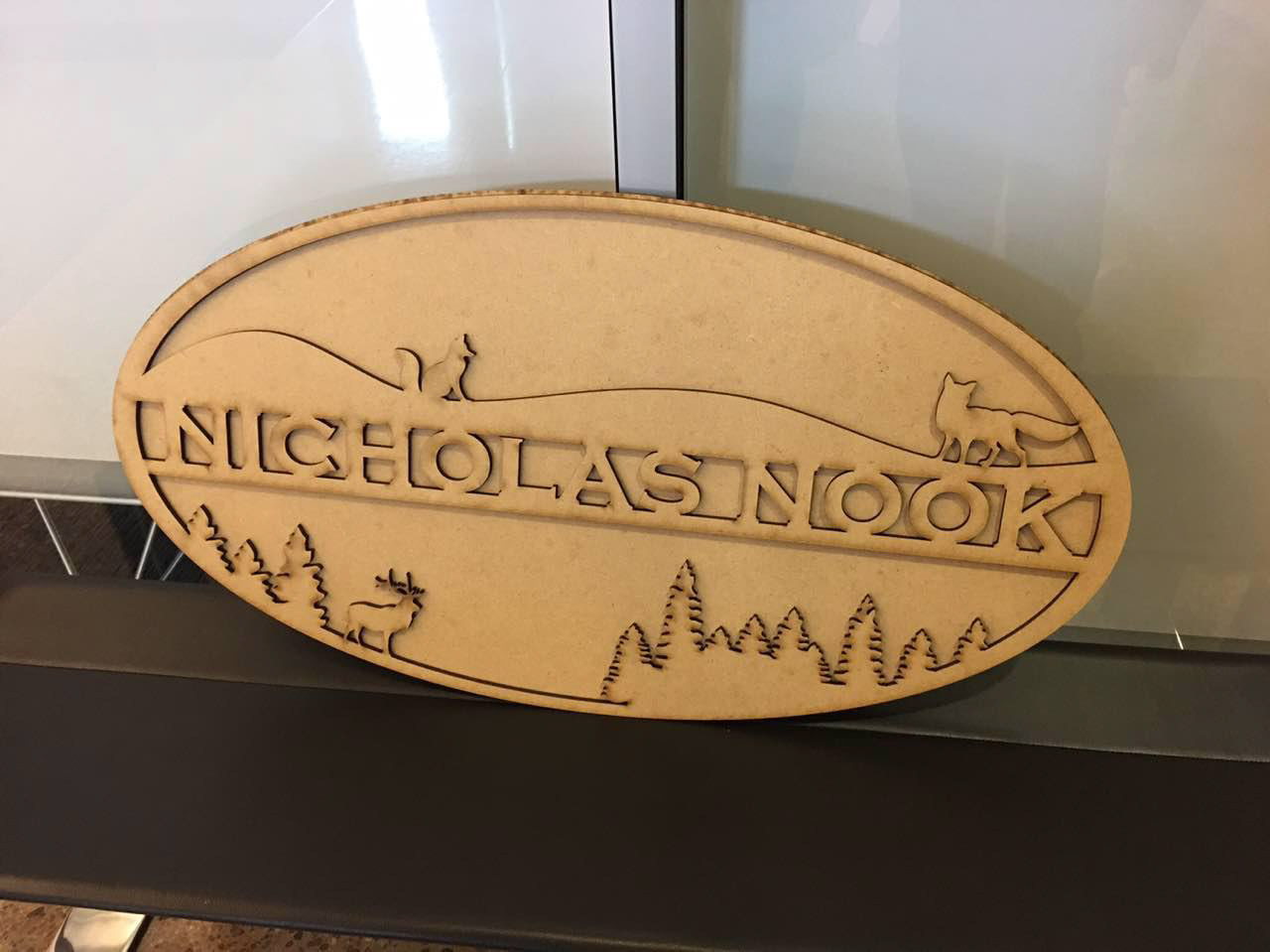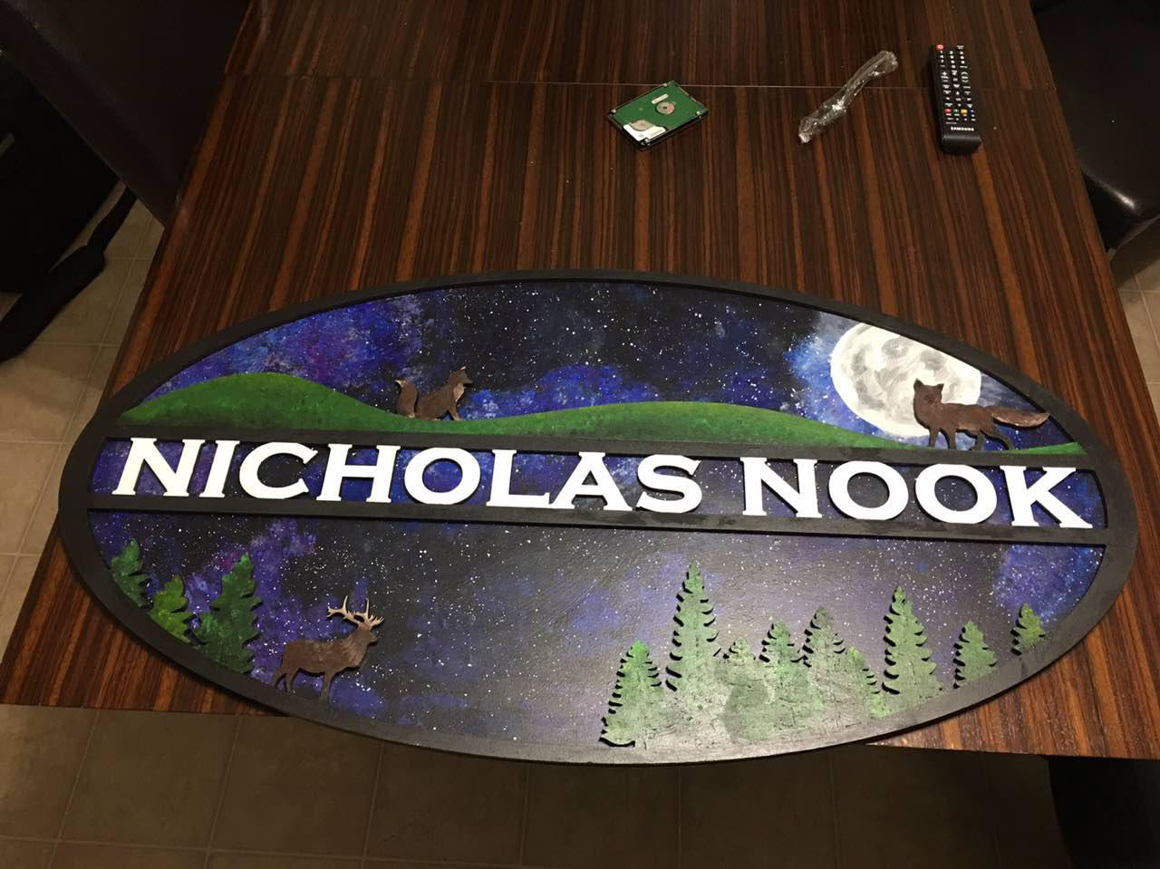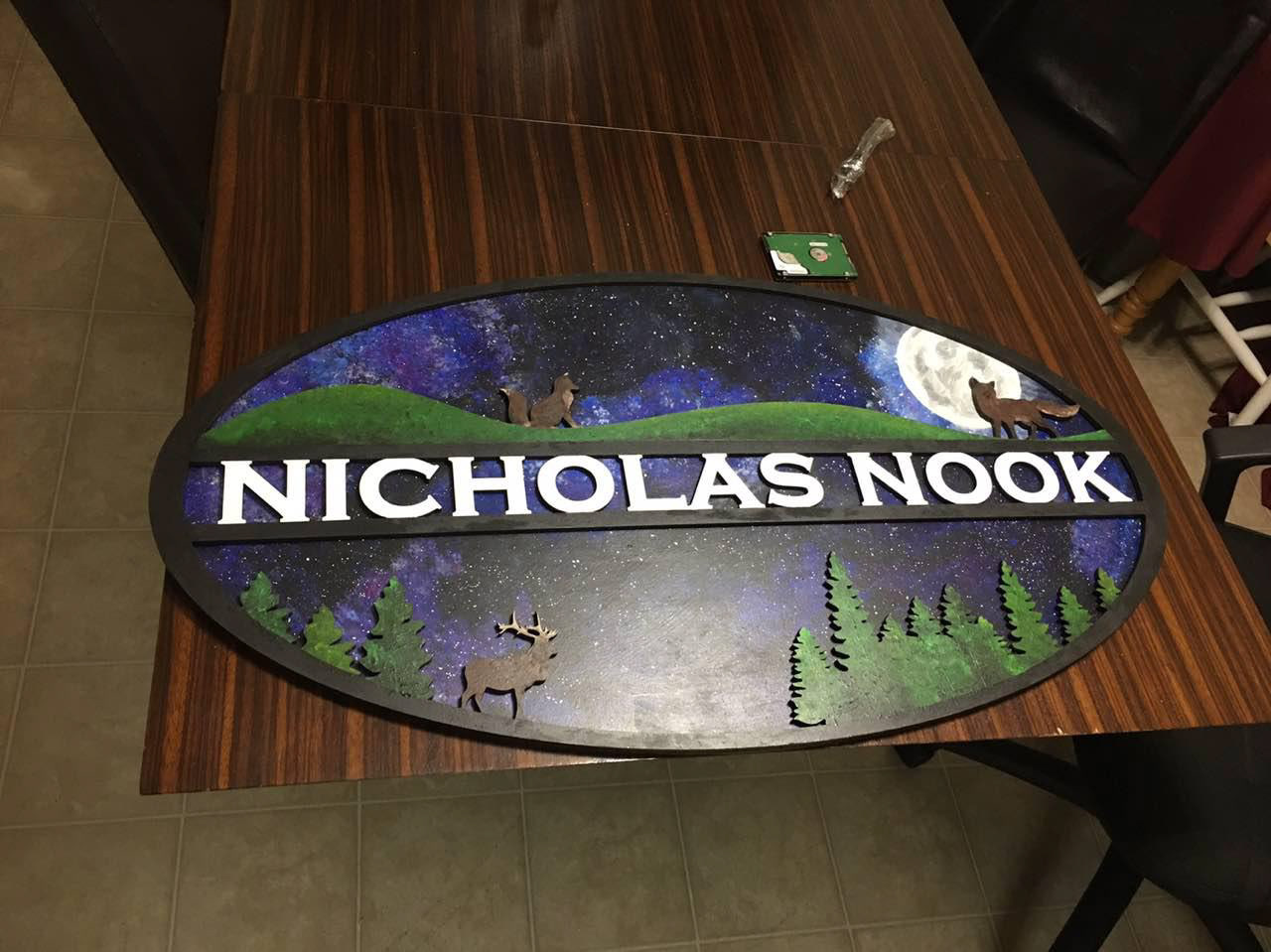 A large sign designed, fabricated, painted and installed. Requested to fit a forest theme, which included the husband and wife incorporated into the sign as animals, the foxes.